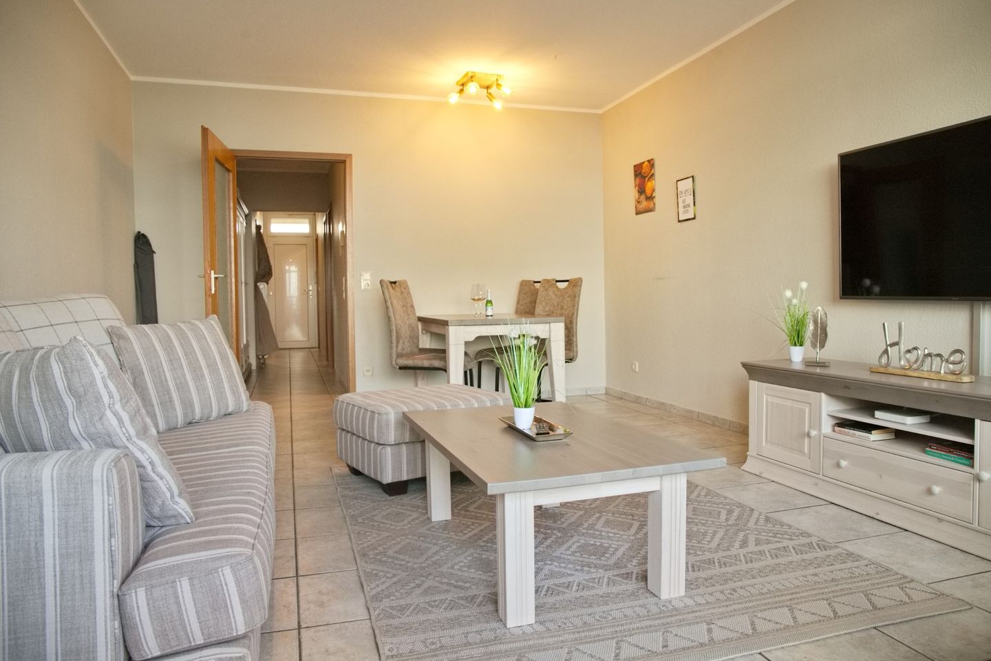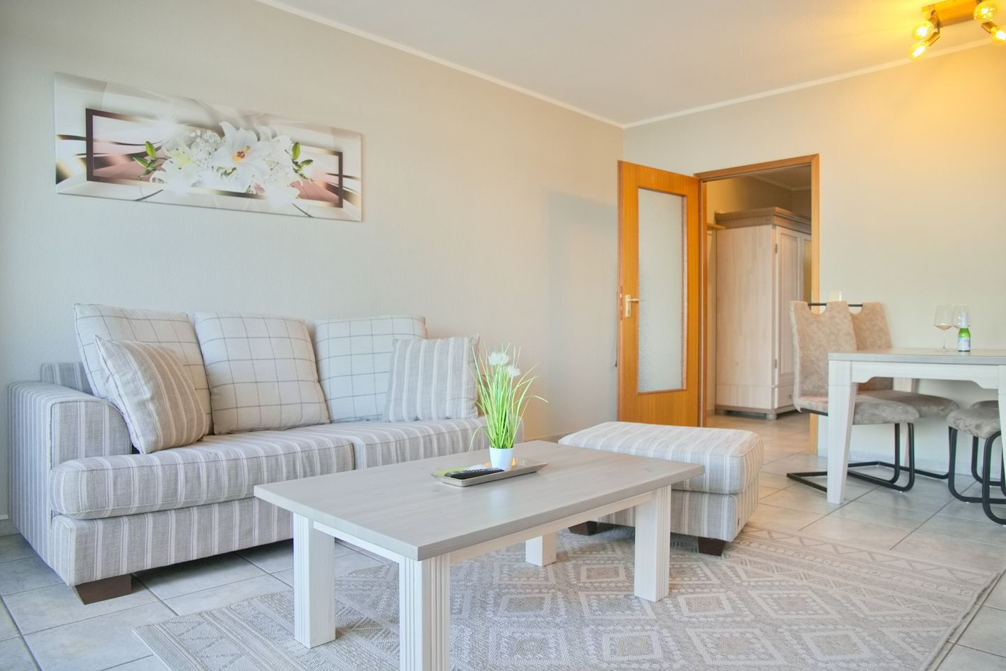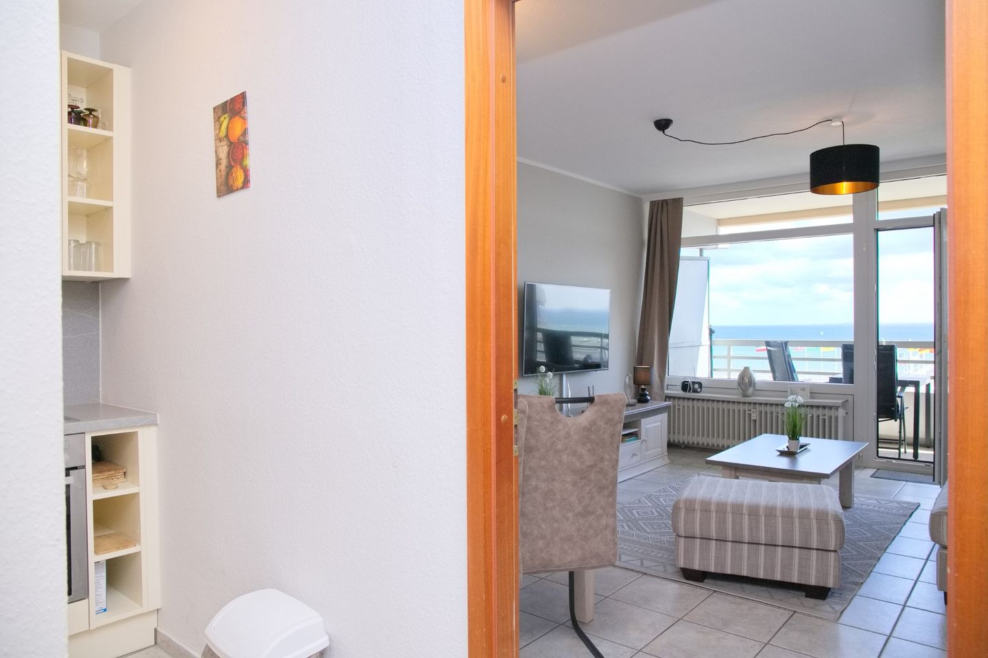 Beim Betreten der Wohnung werden Sie von einem hellen und modernen Wohnbereich empfangen. Die großen Panoramafenster lassen das natürliche Licht herein und bieten Ihnen einen atemberaubenden Blick auf das glitzernde Meer. Der Wohnraum ist geschmackvoll eingerichtet und mit moderne Möbeln ausgestattet.