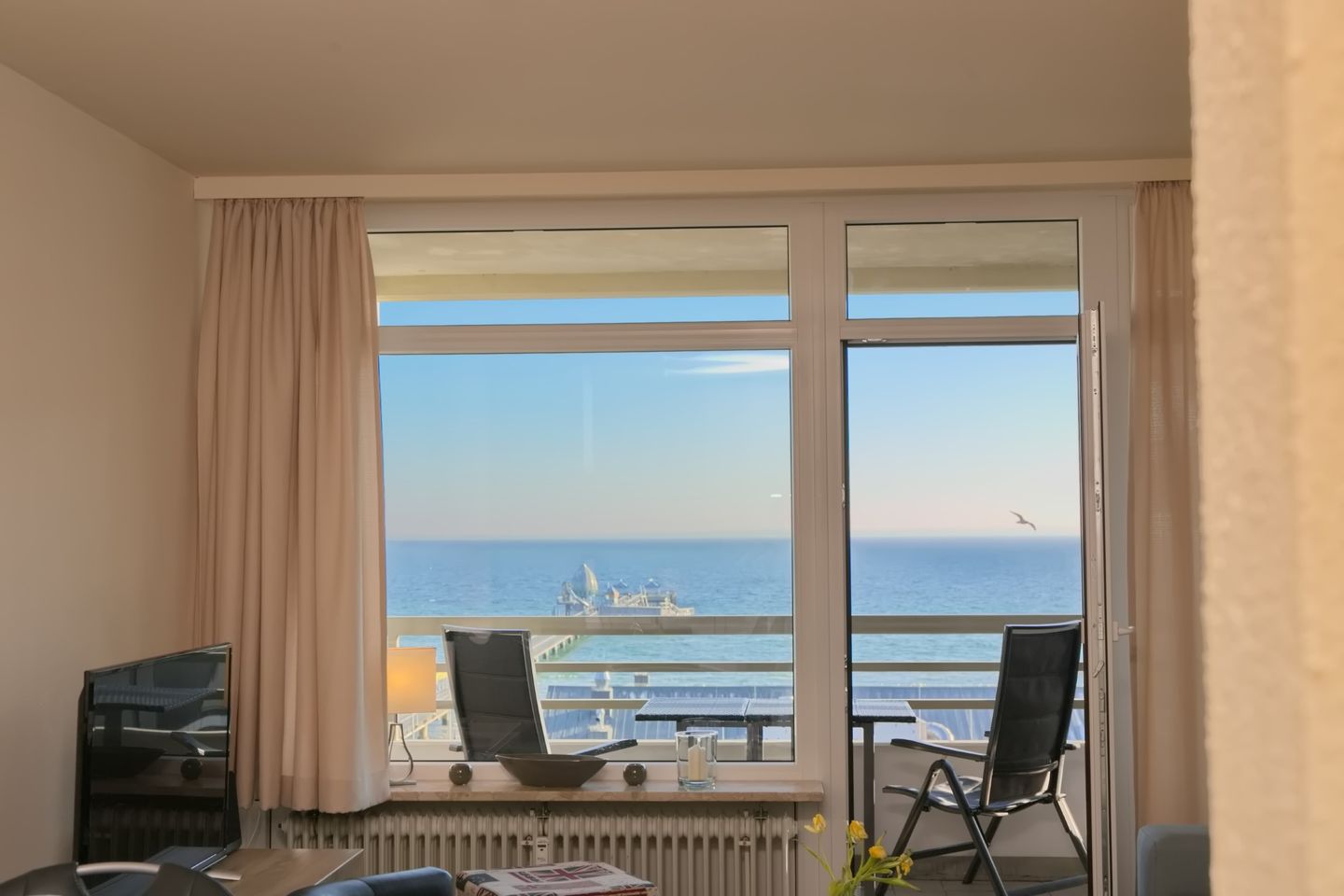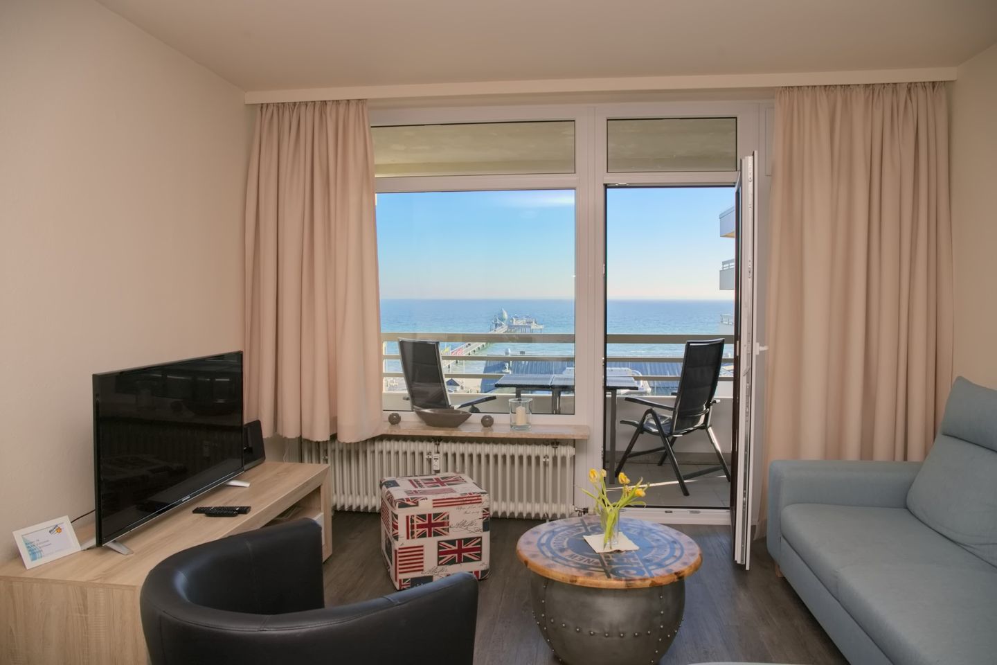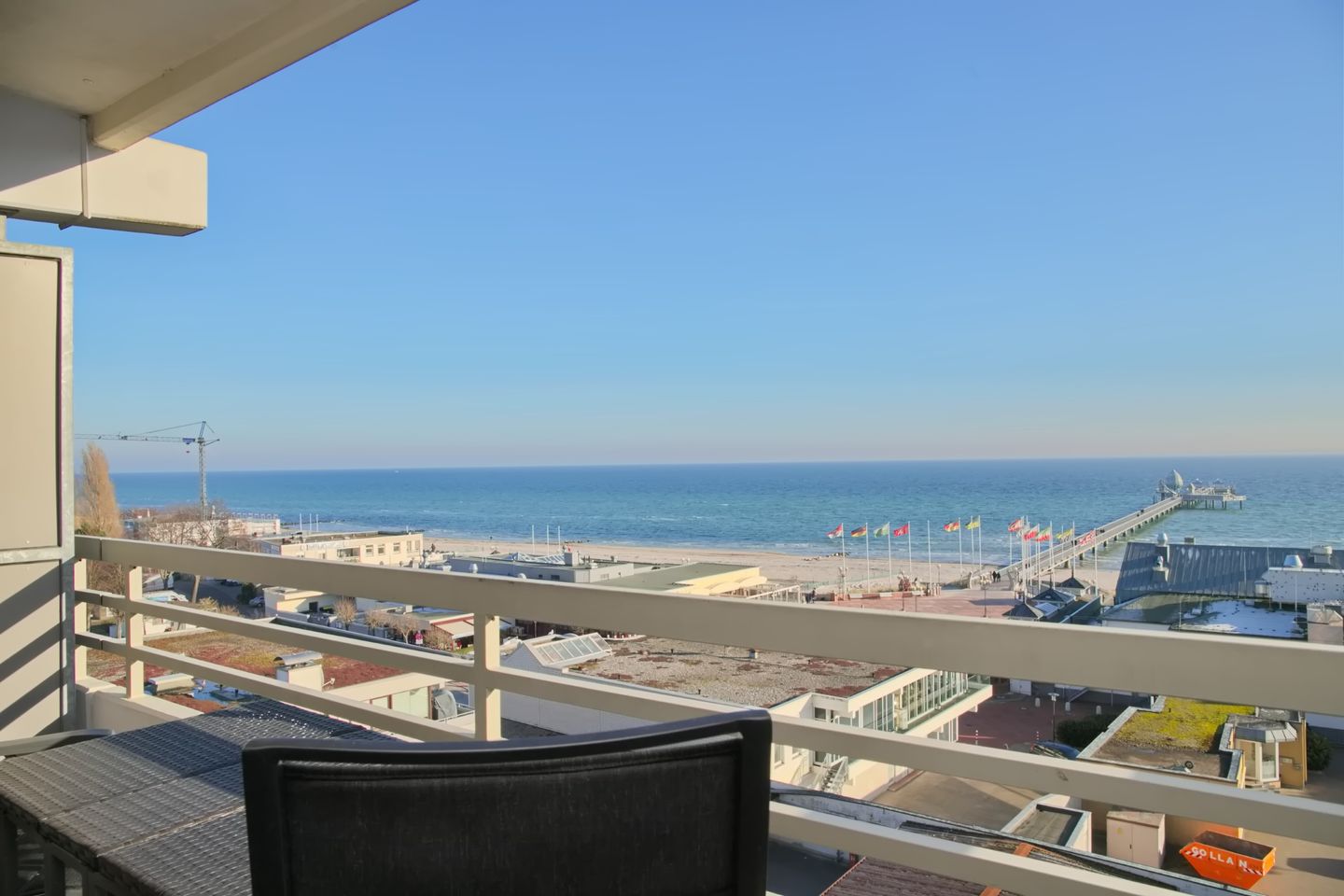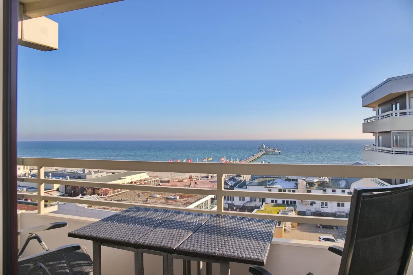 Diese sehr schöne 3-Zimmer-Wohnung (ca. 53 m²) für max. 4 Personen befindet sich in der 7. Etage mit Meerblick auf die Seebrücke. Der möblierte Balkon befindet sich in Südlage. Das Wohnzimmer verfügt über eine Eckcouch und Sessel, großen Flach-TV, CD/Radio mit USB sowie eine Essecke für 4 Personen. Die zum Wohnzimmer offene neue, moderne Einbauküche ist mit einem Cerankochfeld, Backofen, Geschirrspüler, Kühlschrank mit Gefrierfach sowie mit Toaster, Kaffeemaschine, Wasserkocher ausgestattet. Das Schlafzimmer ist ausgestattet mit einem Doppelbett (2 x 90 x 200 cm), sowie 2 Nachtschränke. Im Kinderzimmer stehen ein modernes Etagenbett und Sessel. Ein großer Kleiderschrank auf dem Flur bietet viel Stauraum. Das neue Badezimmer verfügt über eine ebenerdige Dusche