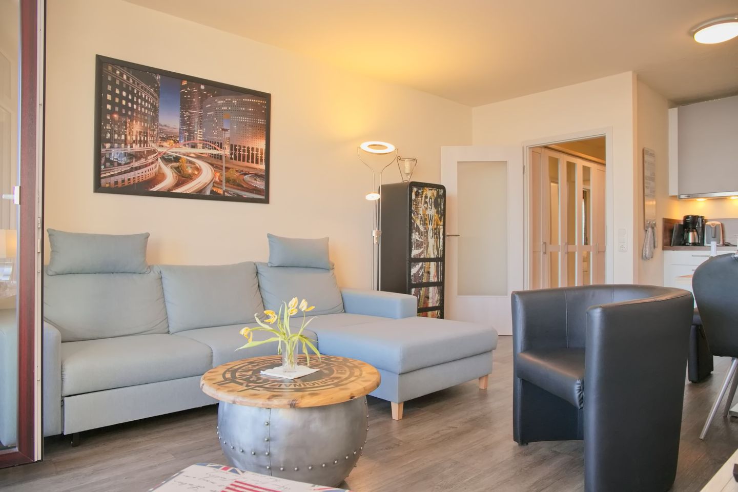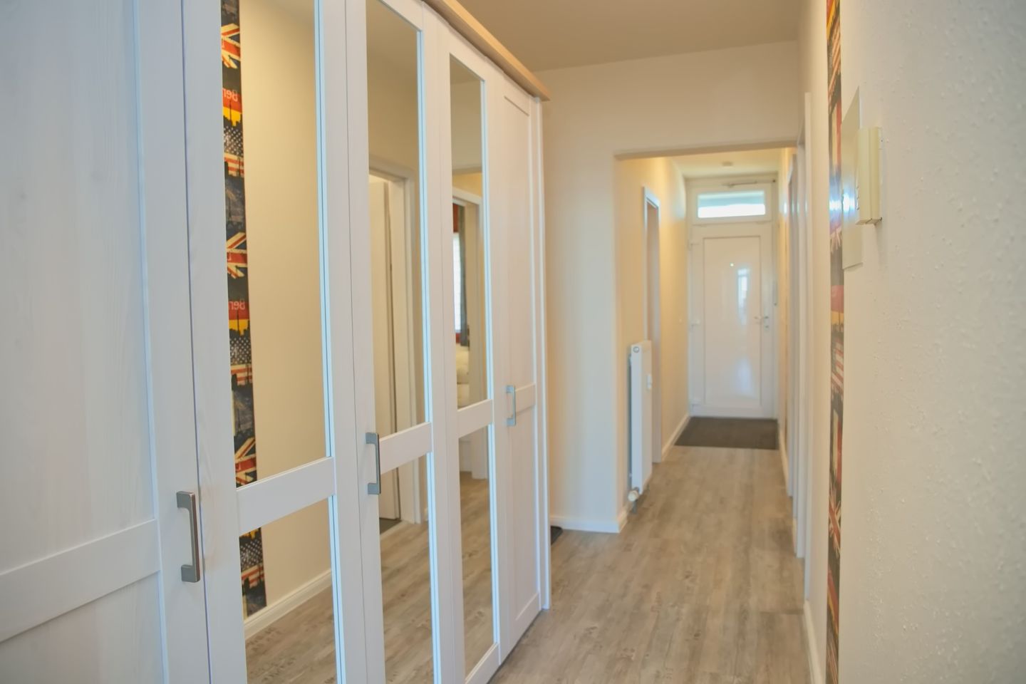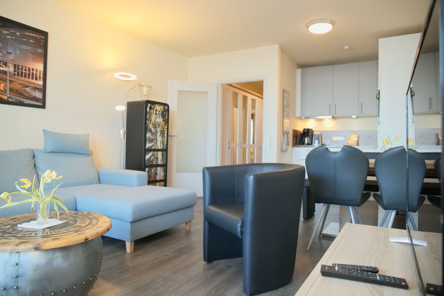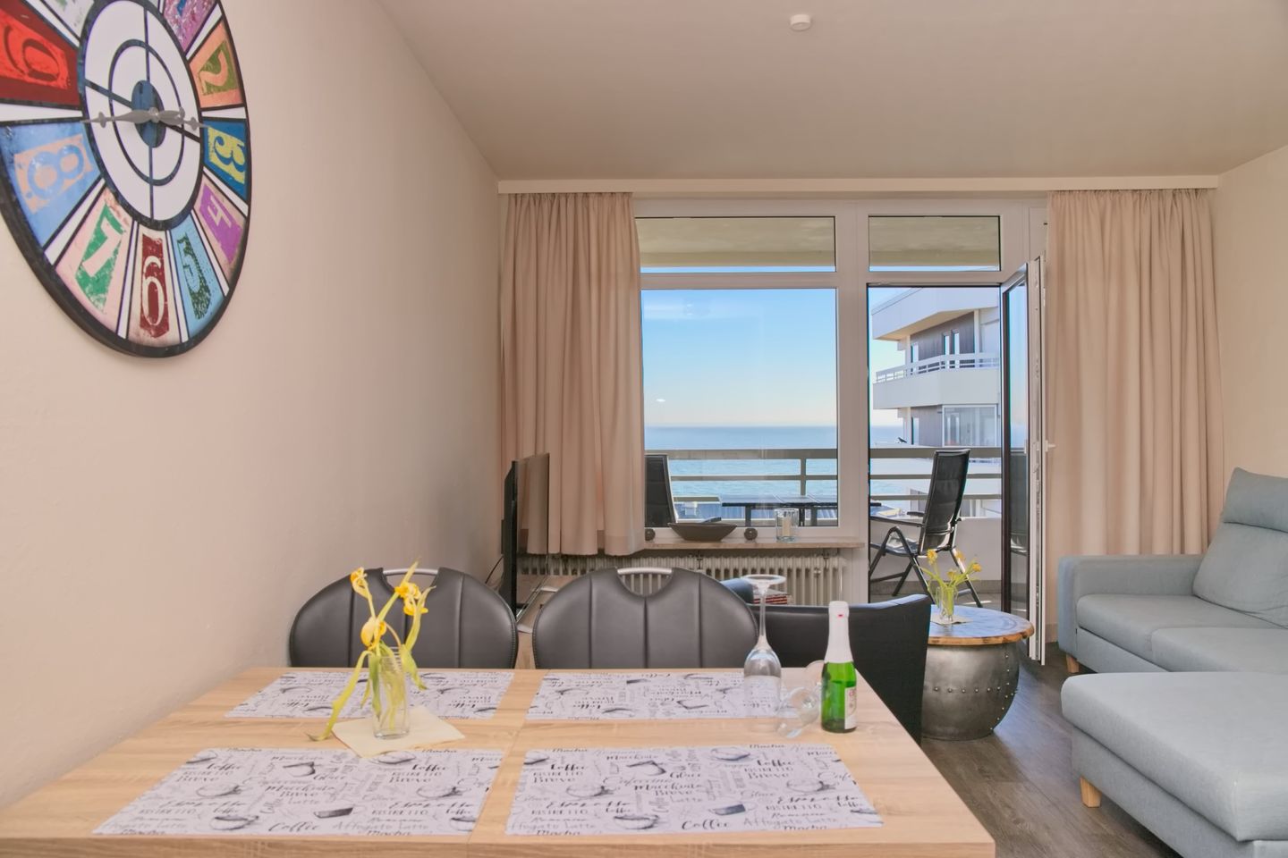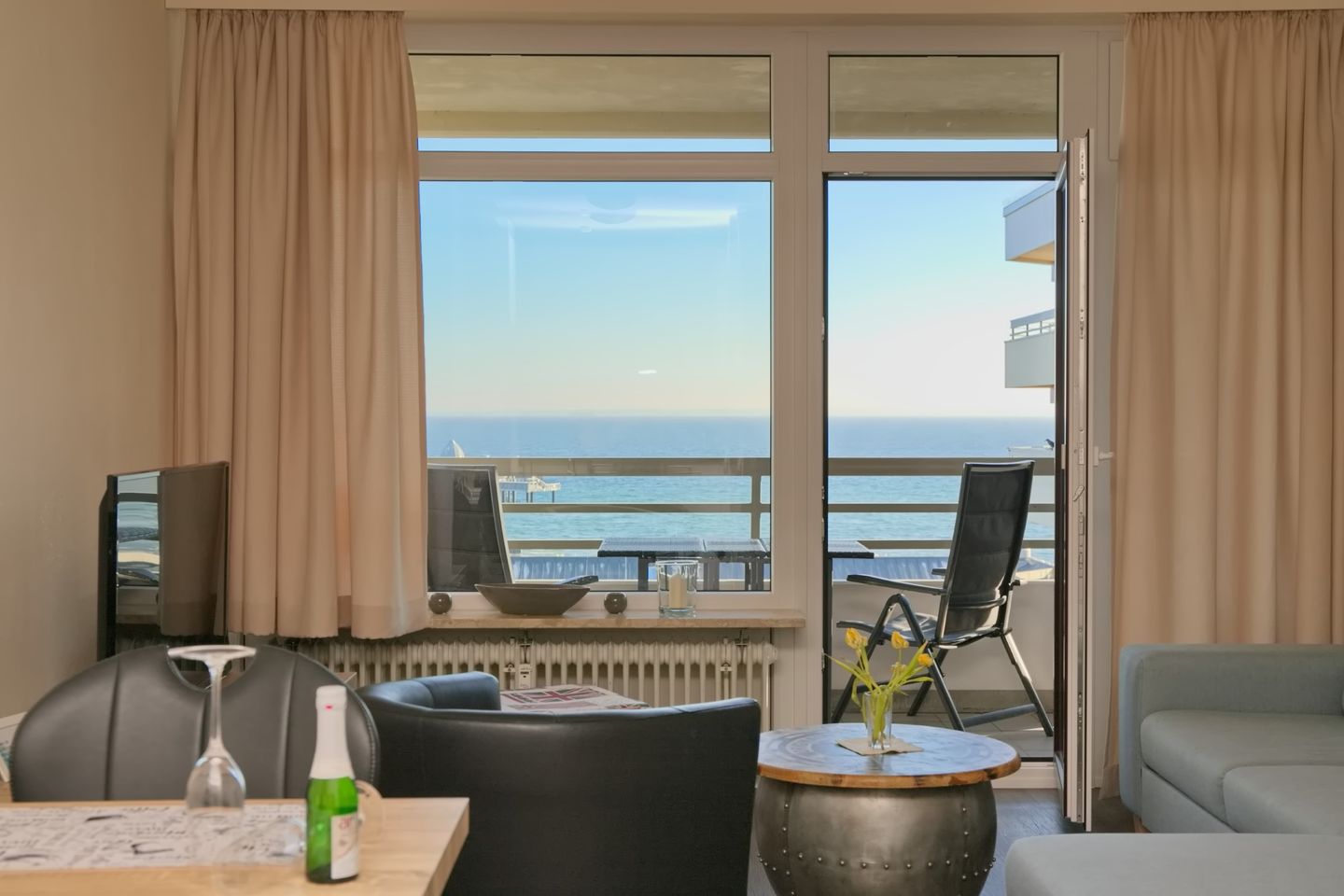 Diese sehr schöne 3-Zimmer-Wohnung (ca. 53 m²) für max. 4 Personen befindet sich in der 7. Etage mit Meerblick auf die Seebrücke. Der möblierte Balkon befindet sich in Südlage. Das Wohnzimmer verfügt über eine Eckcouch und Sessel, großen Flach-TV, CD/Radio mit USB sowie eine Essecke für 4 Personen. Die zum Wohnzimmer offene neue, moderne Einbauküche ist mit einem Cerankochfeld, Backofen, Geschirrspüler, Kühlschrank mit Gefrierfach sowie mit Toaster, Kaffeemaschine, Wasserkocher ausgestattet. Das Schlafzimmer ist ausgestattet mit einem Doppelbett (2 x 90 x 200 cm), sowie 2 Nachtschränke. Im Kinderzimmer stehen ein modernes Etagenbett und Sessel. Ein großer Kleiderschrank auf dem Flur bietet viel Stauraum. Das neue Badezimmer verfügt über eine ebenerdige Dusche
