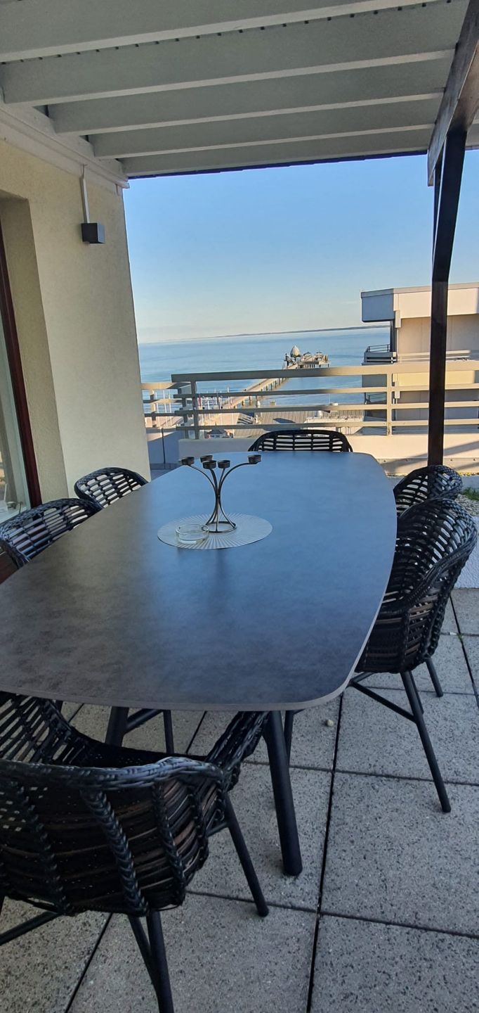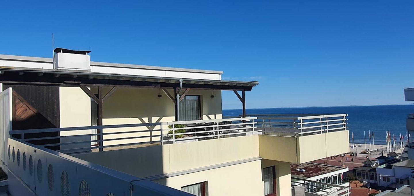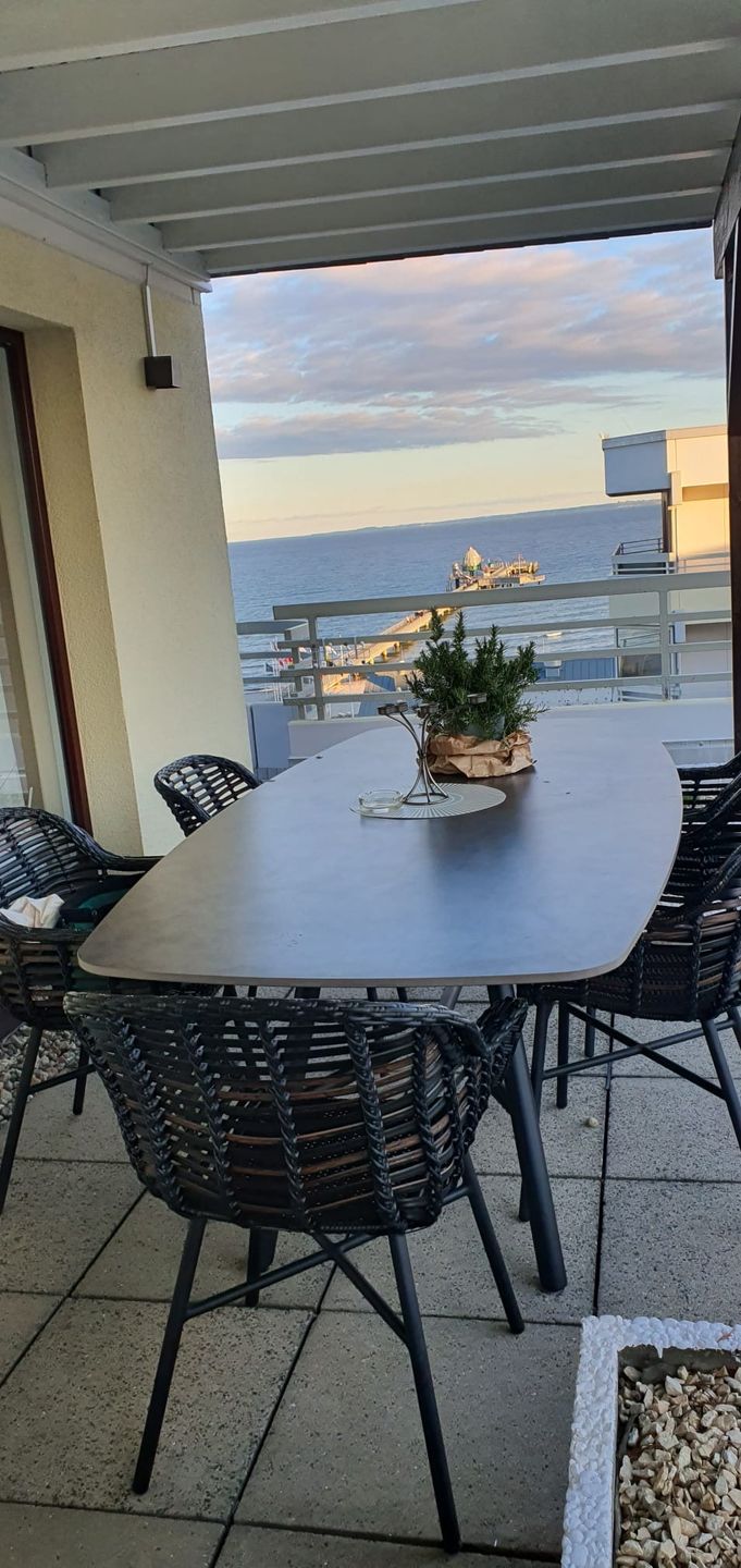 Ein weiteres Highlight der Wohnung ist die großzügige, teilüberdachte Dachterrasse, die direkt an den Balkon anschließt. Diese Terrasse bietet Ihnen noch mehr Platz zum Entspannen und Wohlfühlen. Sie ist teilweise überdacht, sodass Sie auch bei nicht ganz so schönem Wetter die frische Luft genießen können. Die Dachterrasse ist mit bequemen Sitzmöbeln ausgestattet, ideal für ein Sonnenbad oder ein gemütliches Beisammensein mit Familie und Freunden. Hier oben können Sie die Ruhe und den fantastischen Ausblick auf das Meer und die Seebrücke in vollen Zügen genießen.