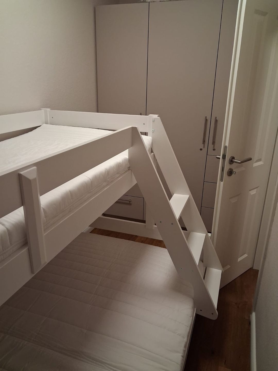 Das Schlafzimmer ist mit einem Etagenbett ausgestattet mit einer unteren Liegefläche von 140x200 cm und einer oberen Liegefläche von 100x200 cm. Ein geräumiger Kleiderschrank und Verdunkelungsgardinen sorgen für zusätzlichen Komfort.